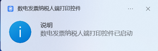 5. 电脑桌面出现如图 5所示图标,并在任务栏弹出“数电发票纳税人端打印控件已启动”的提示,如图6所示,表示控件已安装完成并成功启动。