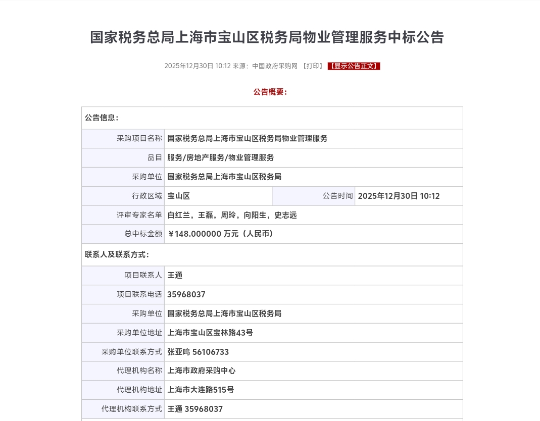 名称: 国家税务总局上海市宝山区税务局物业管理服务中标公告