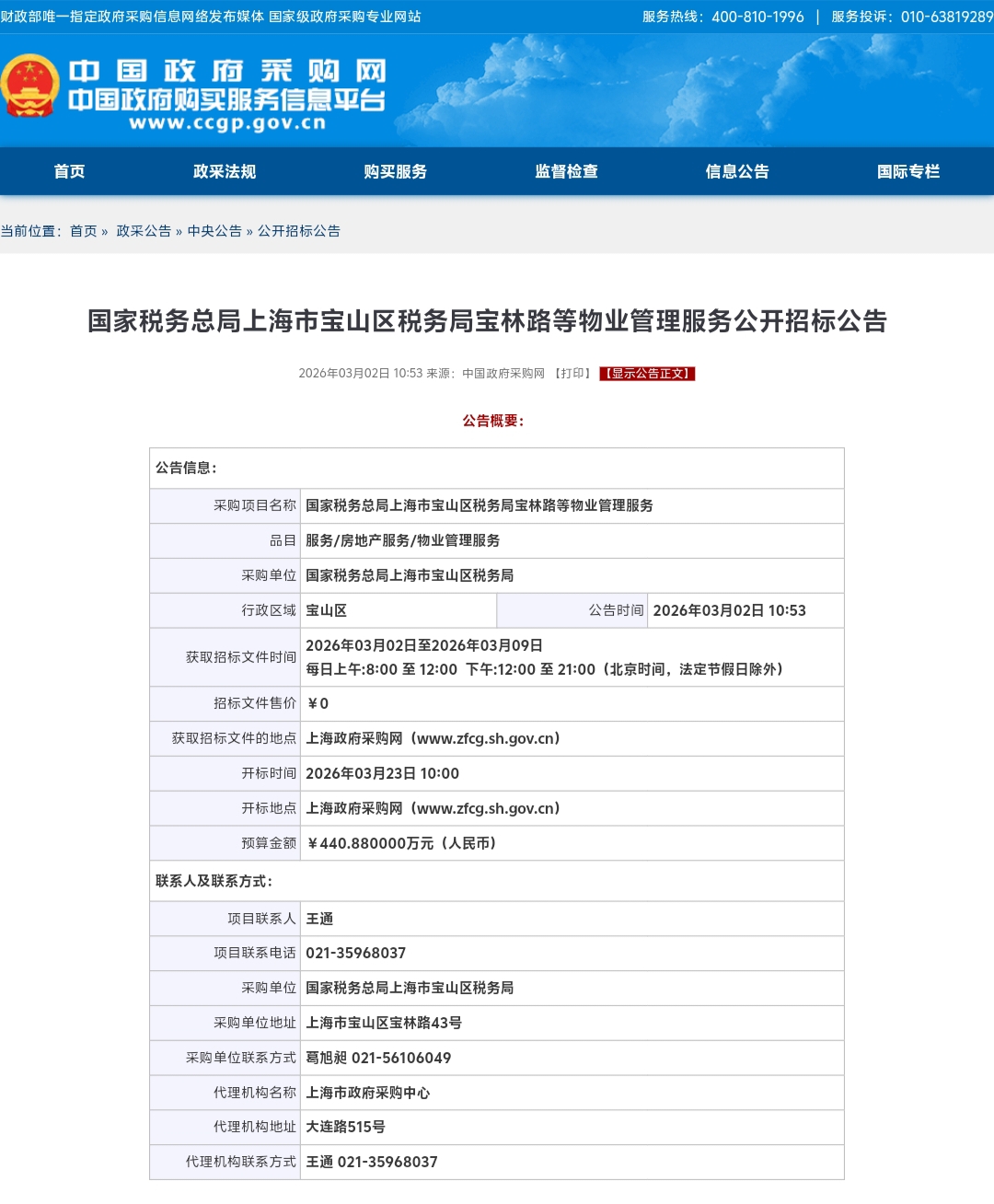 国家税务总局上海市宝山区税务局宝林路等物业管理服务招标公告