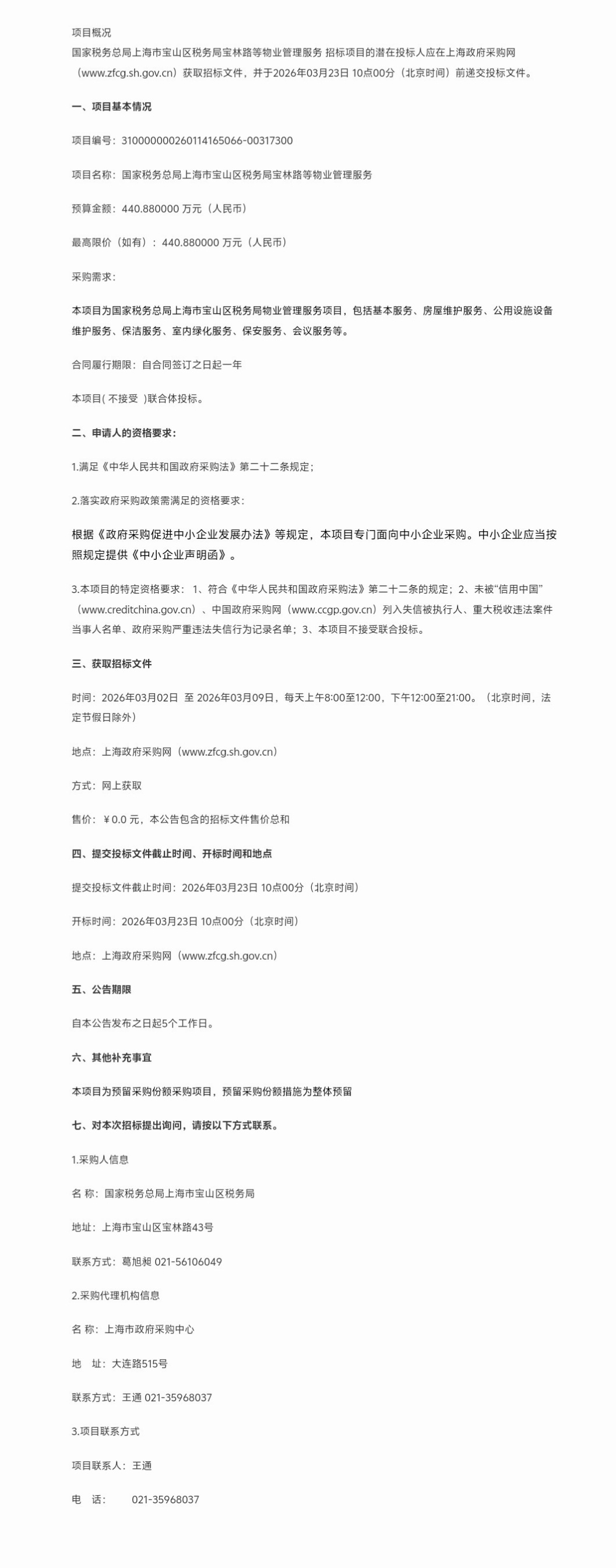 名称: 国家税务总局上海市宝山区税务局宝林路等物业管理服务招标公告