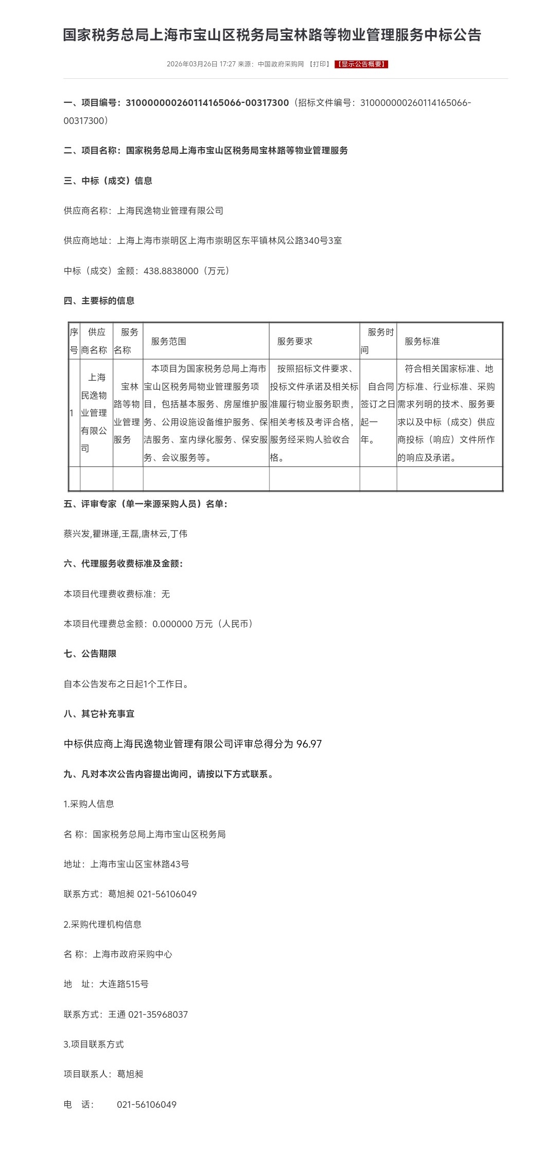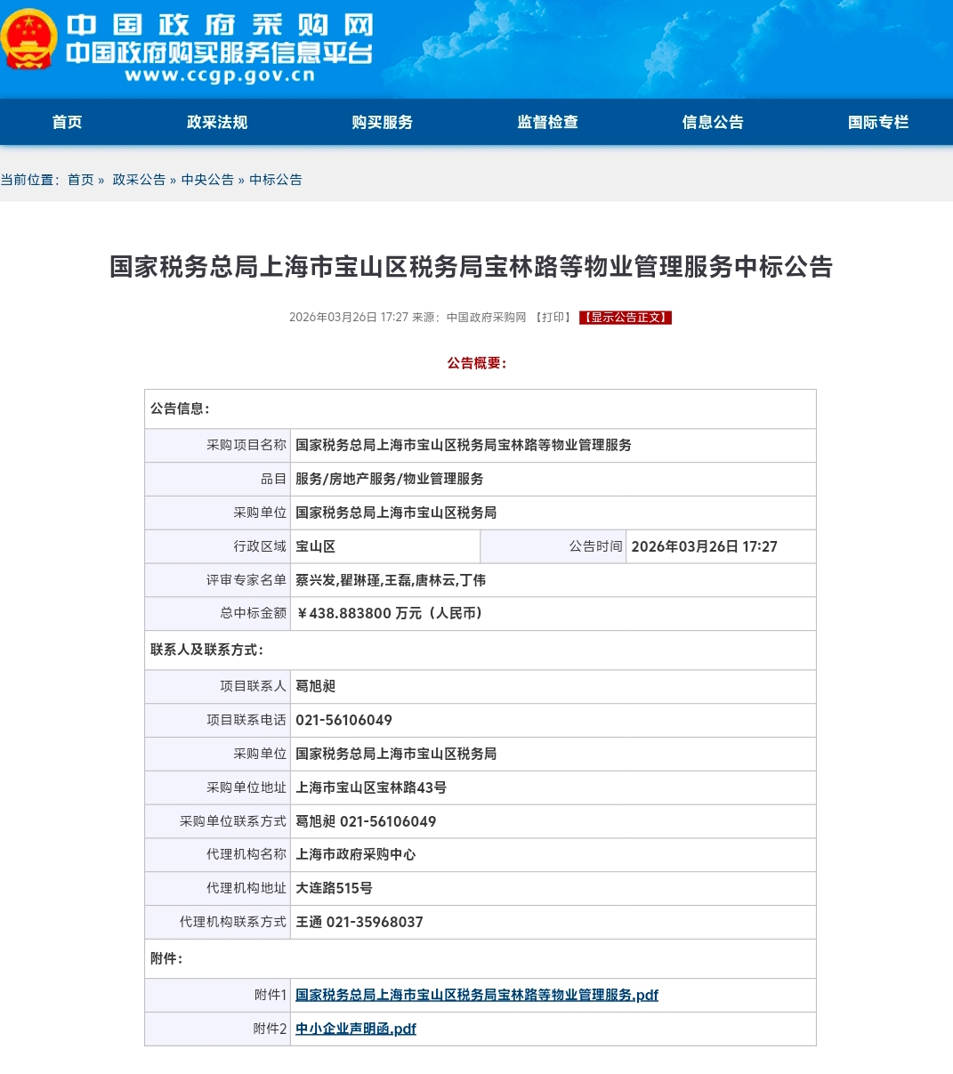 国家税务总局上海市宝山区税务局宝林路等物业管理服务中标公告