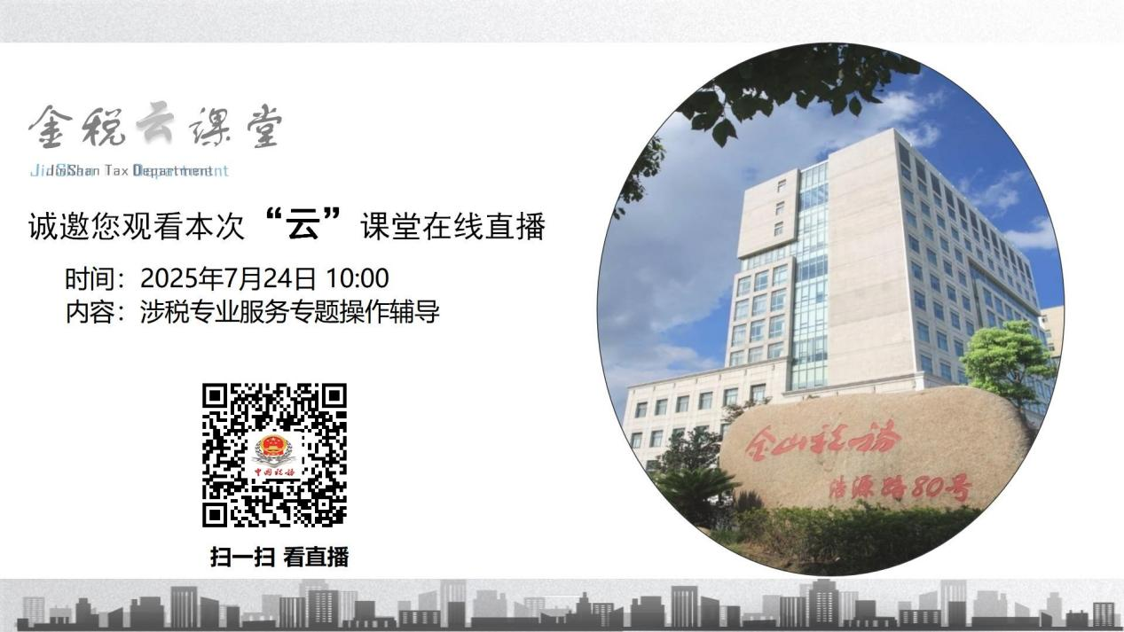 金山区税务局将于2025年7月24日10:00举办金税“云”课堂,主题是涉税专业服务专题操作辅导,诚邀您的观看。您可通过扫描下方图片中的二维码或点击链接进行观看,直播结束后,您也可在原地址观看直播回访。