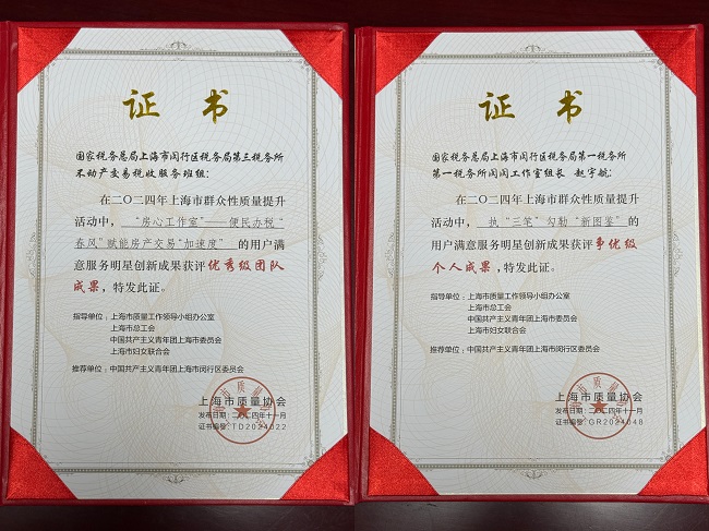 上海市质量协会发布了2024年用户满意服务明星创新活动成果,闵行区税务局第三税务所的不动产交易税收青年服务班组凭借《“房心工作室”——便民办税“春风”赋能房产交易“加速度”》荣获 “2024 年用户满意服务明星创新(团队成果)优秀级”荣誉,第一税务所青年赵宇航以其《执“三笔”勾勒“新图鉴”》荣获 “2024 年用户满意服务明星创新(个人成果)争优级” 荣誉。