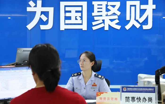 图为在银川市西夏区税务局办税服务厅,“简事快办岗”税务干部为纳税人办理业务。