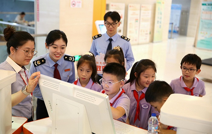 近日,浦东新区税务局第四十二税务所与新区政务服务中心联合开展的政务开放系列活动温情启幕。活动邀请福山证大外国语小学三十余位同学走进政务服务大厅,通过“数字人参观+趣味课堂+办税体验”等多彩形式,将书本上的政务、税收知识转化为生动的童年记忆,沉浸式感受“政务+税收”工作规范与服务温度。