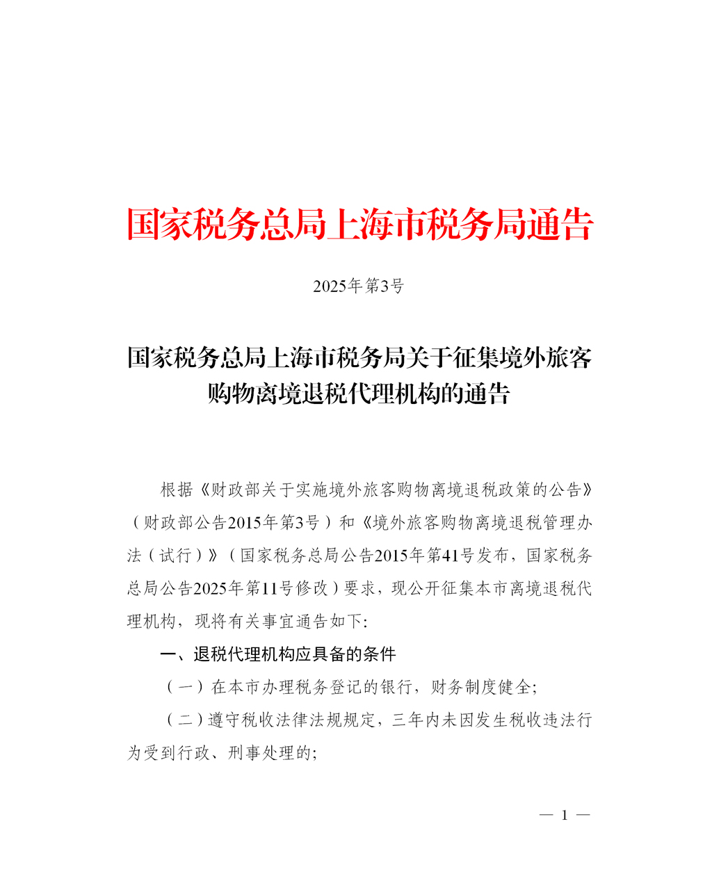 根据《财政部关于实施境外旅客购物离境退税政策的公告》(财政部公告2015年第3号)和《境外旅客购物离境退税管理办法(试行)》(国家税务总局公告2015年第41号发布,国家税务总局公告2025年第11号修改)要求,现公开征集本市离境退税代理机构,现将有关事宜通告如下:
