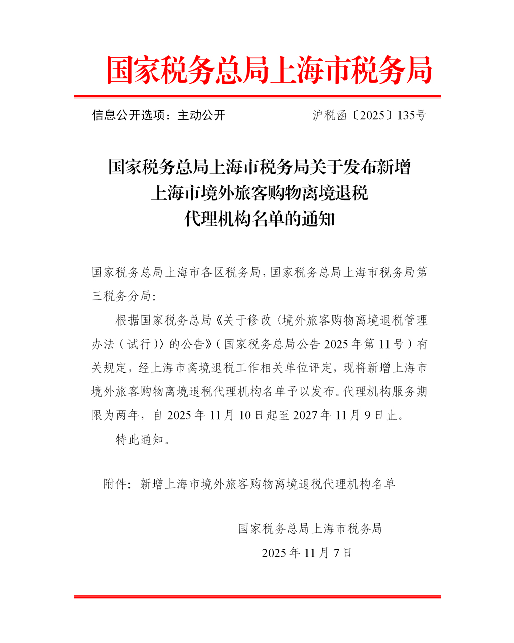 根据国家税务总局《关于修改〈境外旅客购物离境退税管理办法(试行)〉的公告》(国家税务总局公告2025年第11号)有关规定,经上海市离境退税工作相关单位评定,现将新增上海市境外旅客购物离境退税代理机构名单予以发布。代理机构服务期限为两年,自2025年11月10日起至2027年11月9日止。