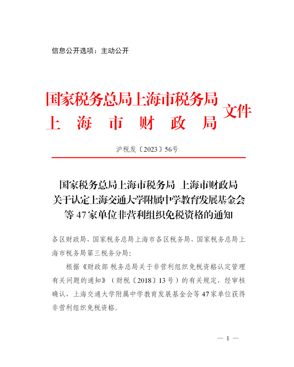 根据《财政部 税务总局关于非营利组织免税资格认定管理有关问题的通知》(财税〔2018〕13号)的有关规定,经审核确认,上海交通大学附属中学教育发展基金会等47家单位获得非营利组织免税资格。