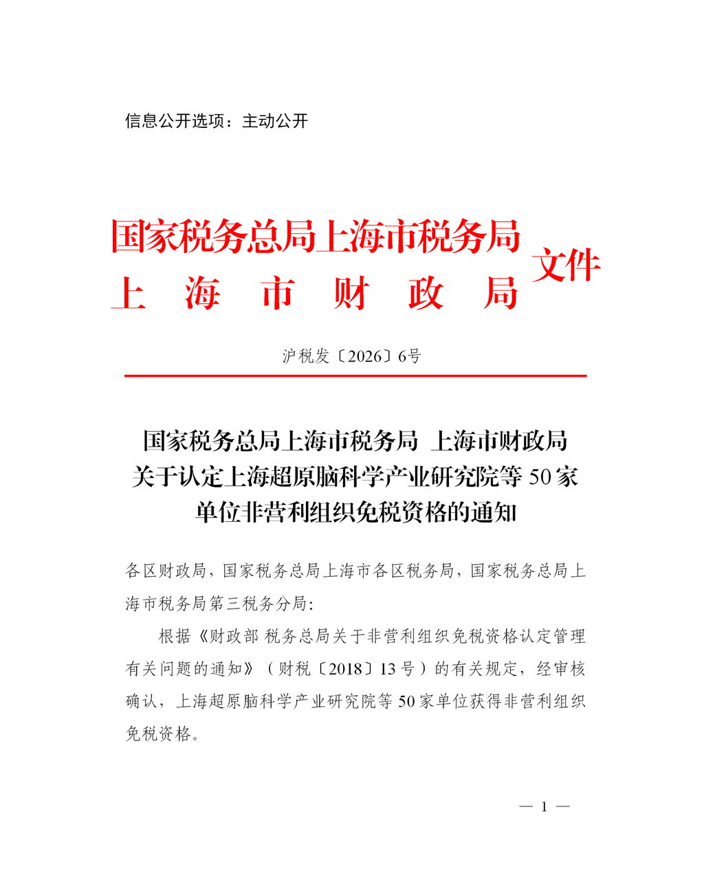 根据《财政部 税务总局关于非营利组织免税资格认定管理有关问题的通知》(财税〔2018〕13号)的有关规定,经审核确认,上海超原脑科学产业研究院等50家单位获得非营利组织免税资格。