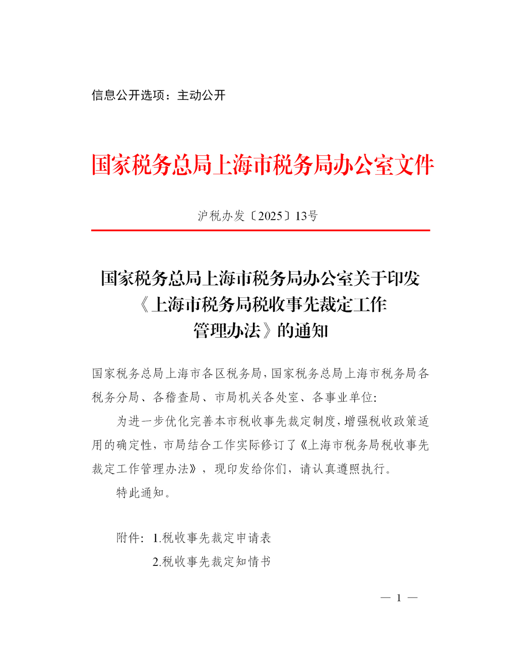 为进一步优化完善本市税收事先裁定制度,增强税收政策适用的确定性,市局结合工作实际修订了《上海市税务局税收事先裁定工作管理办法》,现印发给你们,请认真遵照执行。